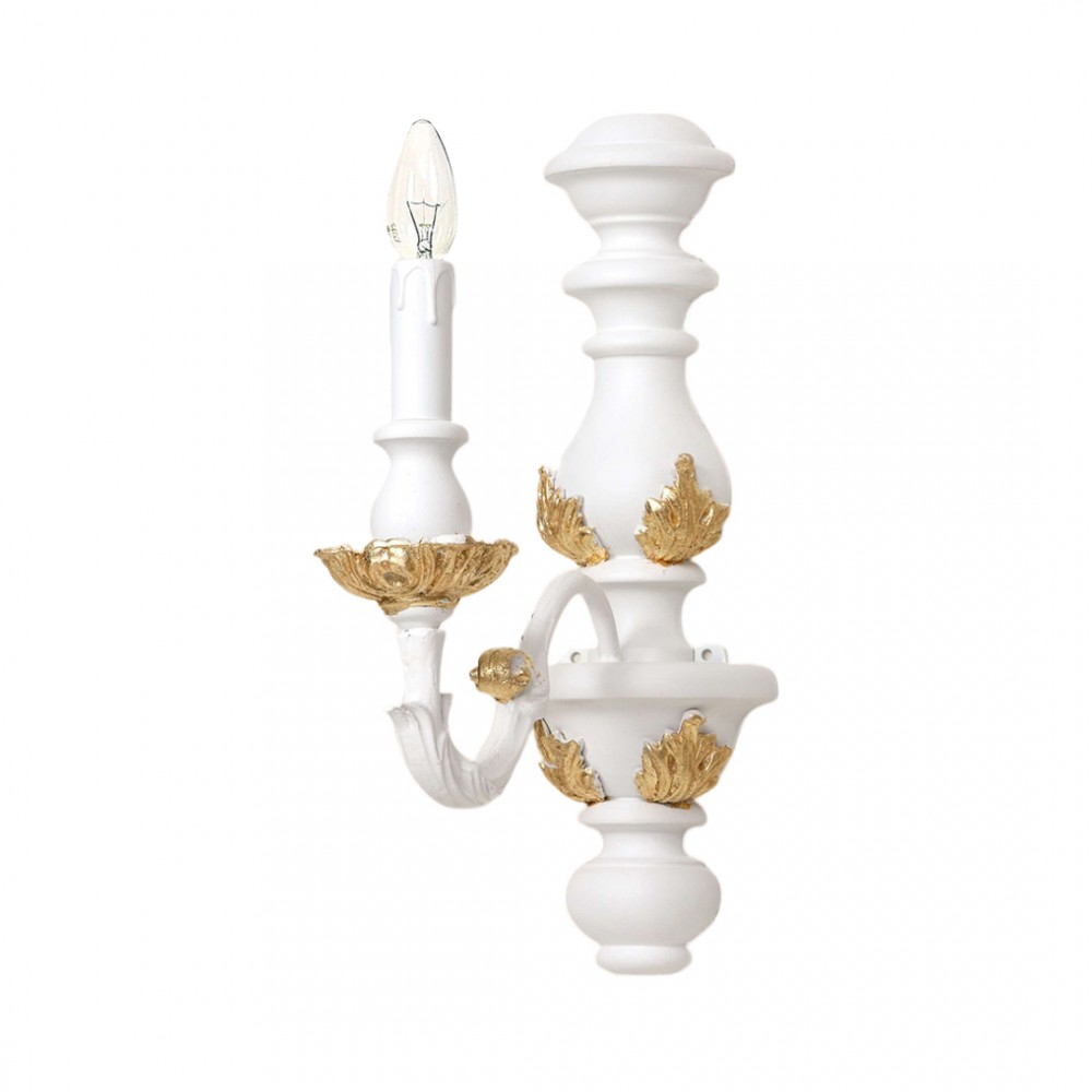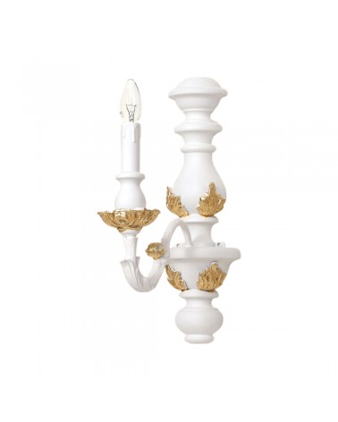 Applique realizzato a mano dai nostri mastri artigiani seguendo le più antiche tradizioni del legno. Struttura in legno intarsiato color bianco oro naturale. Monta 1 lampadina E14 (non inclusa) . Adatto ad un arredamento classico e raffinato