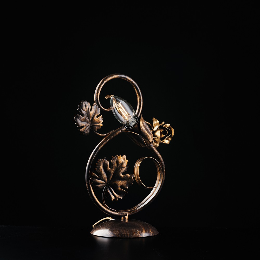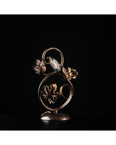 Lumetto o lampada da appoggio realizzata artigianalmente in metallo. Applicazioni con foglie e fiori in ferro battuto. Ideale per sala, soggiorno, zona living, sala da pranzo, cucina, salone, taverna, corridoio. La naturalezza dei fiori e delle foglie doneranno sobrietà e morbidezza al vostro ambiente.