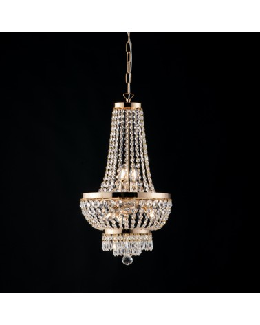 Lampadario a sospensione realizzato in metallo dorato. Applicazioni con pendenti realizzati in svarowski crystal k9 ottagonali. Ideale per salone, sala, soggiorno, zona living, corridoio, camera da letto, boutique, hall. Stile intramontabile. Un elemento che darà un immenso valore all'ambiente grazie alla luce dei cristalli di strass.