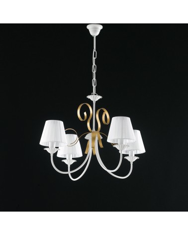 Lampadario a sospensione realizzato in metallo verniciato bianco, decorazione oro. Fregi modellati a mano in ferro battuto. Paralume in pvc lavabile. Ideale per salone, sala, soggiorno, zona living, corridoio, camera da letto, boutique, hall. Un elemento semplice che riempirà di luce l'ambiente e donerà calore grazie alla combinazione di colori ed alle forme sinuose del metallo.