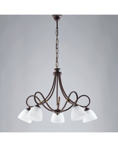 Lampadario a sospensione realizzato artigianalmente in metallo. Bracci in ferro battuto sagomati a mano. Coppe in vetro realizzate a mano. Ideale per sala, soggiorno, zona living, sala da pranzo, cucina, salone, taverna, corridoio, camera da letto. Design classico ed elegante, si abbina con qualsiasi tipo di arredamento classico o contemporaneo.