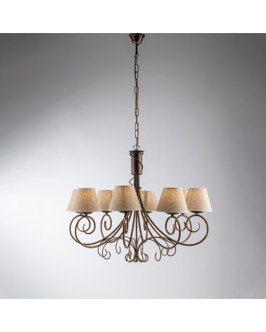 Lampadario a sospensione realizzato in metallo. Paralume in pvc lavabile. Applicazioni con decorazioni artigianali in ferro battuto. Ideale per salone, sala, soggiorno, zona living, corridoio, camera da letto, boutique, hall. Stile intramontabile. Un elemento che darà un immenso valore all'ambiente grazie alla luce dei cristalli di strass.
