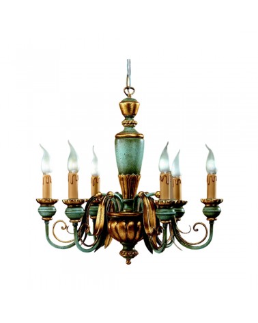 Lampadario realizzato a mano dai nostri mastri artigiani seguendo le più antiche tradizioni del legno. Struttura in legno intarsiato color azzurro oro. Monta 6 lampadine E14 (non inclusa) . Adatto ad un arredamento classico e raffinato