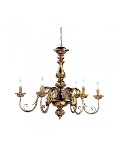 Lampadario realizzato a mano dai nostri mastri artigiani seguendo le più antiche tradizioni del legno. Struttura in legno intarsiato color oro marrone e nocciola. Monta 6 lampadine E14 (non inclusa) . Adatto ad un arredamento classico e raffinato