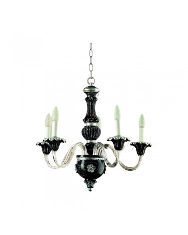 Lampadario realizzato a mano dai nostri mastri artigiani seguendo le più antiche tradizioni del legno. Struttura in legno intarsiato color nero graffiato. Monta 5 lampadine E14 (non inclusa) . Adatto ad un arredamento classico e raffinato