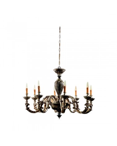 Lampadario realizzato a mano dai nostri mastri artigiani seguendo le più antiche tradizioni del legno. Struttura in legno intarsiato color marrone e argento etrusco. Monta 8 lampadine E14 (non inclusa) . Adatto ad un arredamento classico e raffinato