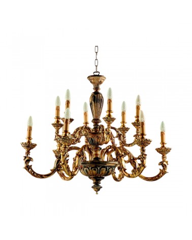 Lampadario realizzato a mano dai nostri mastri artigiani seguendo le più antiche tradizioni del legno. Struttura in legno intarsiato color marrone e oro etrusco . Monta 12 lampadine E14 (non inclusa) . Adatto ad un arredamento classico e raffinato