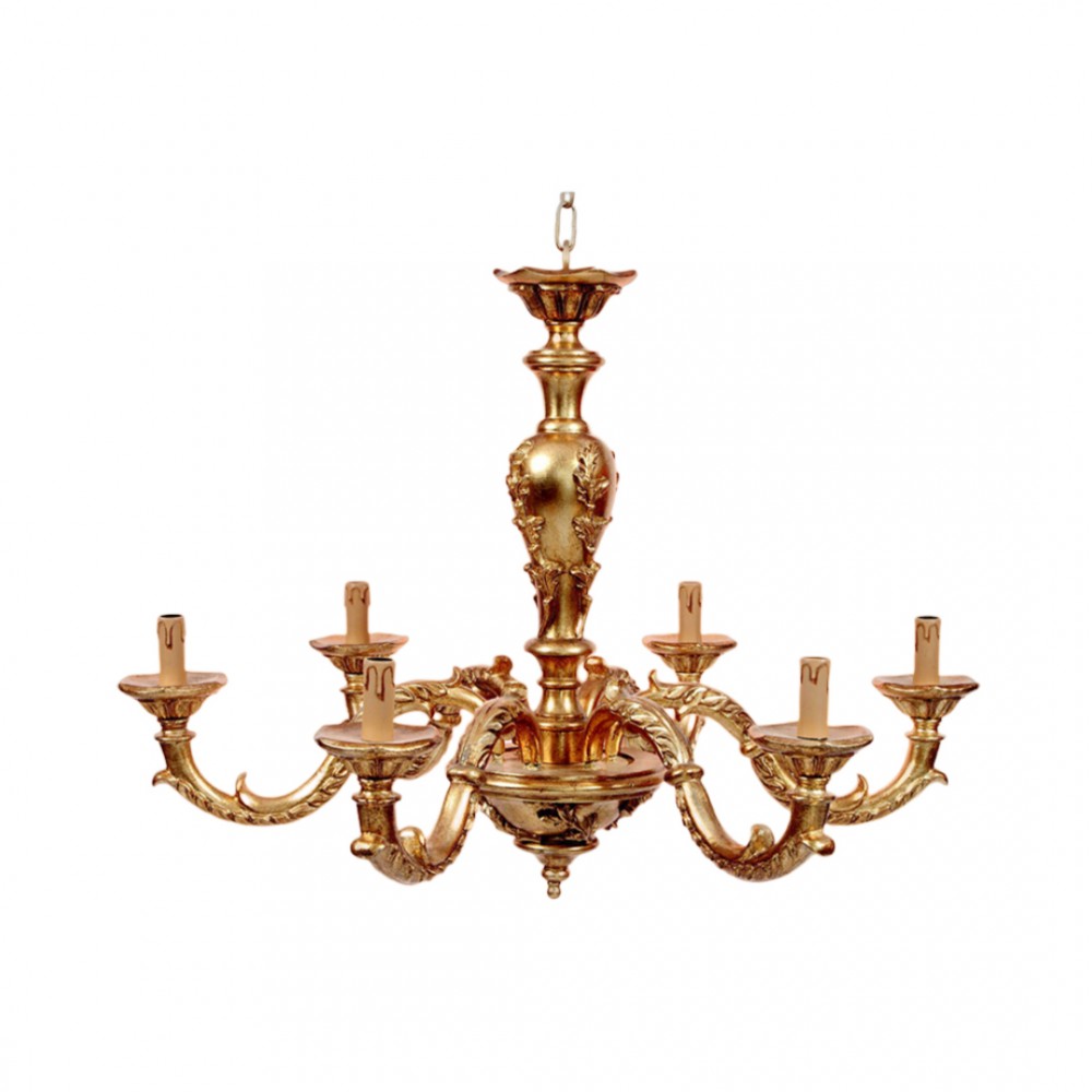 Lampadario realizzato a mano dai nostri mastri artigiani seguendo le più antiche tradizioni del legno. Struttura in legno intarsiato color oro. Monta 6 lampadine E14 (non inclusa) . Adatto ad un arredamento classico e raffinato