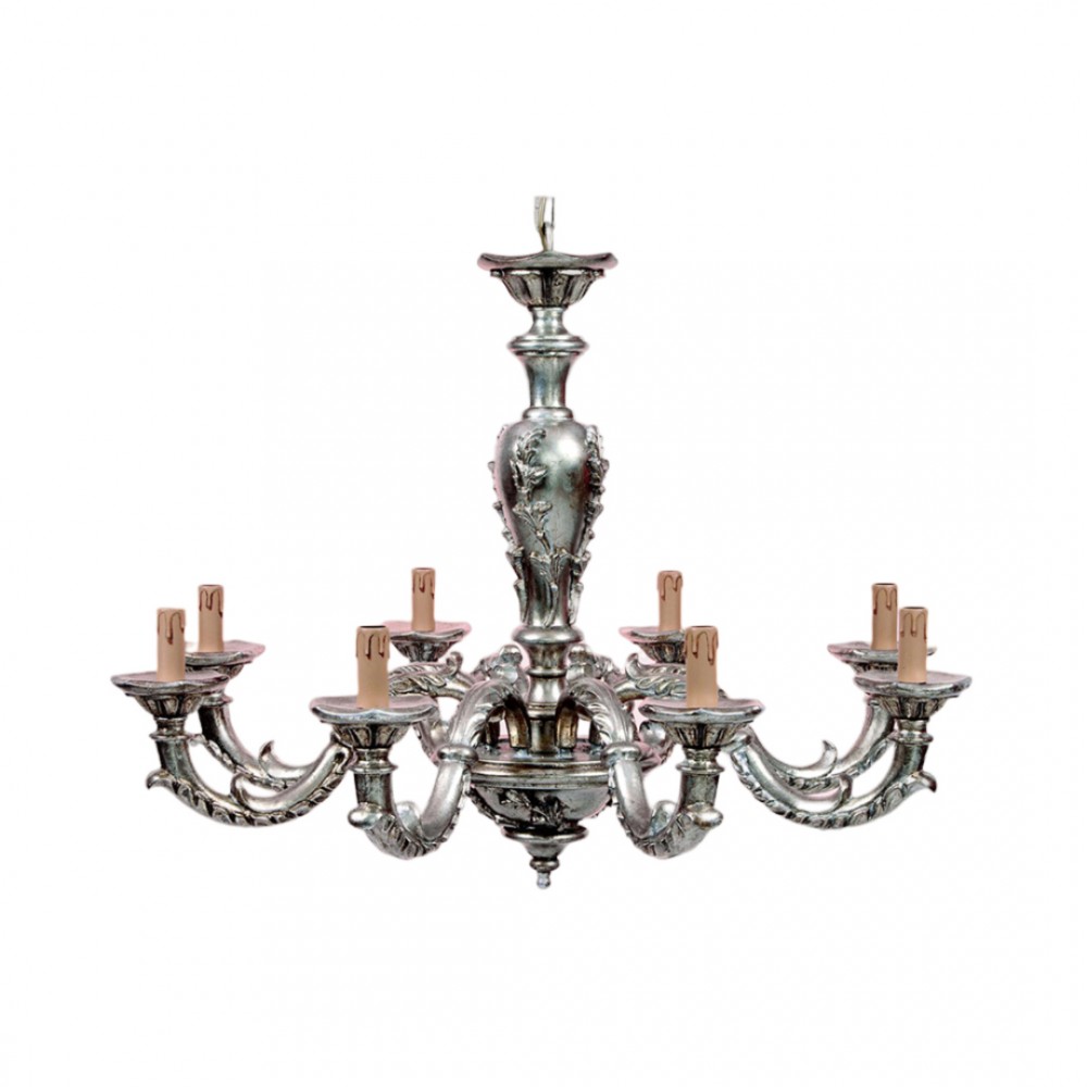 Lampadario realizzato a mano dai nostri mastri artigiani seguendo le più antiche tradizioni del legno. Struttura in legno intarsiato color argento patinato lucido. Monta 8 lampadine E14 (non inclusa) . Adatto ad un arredamento classico e raffinato