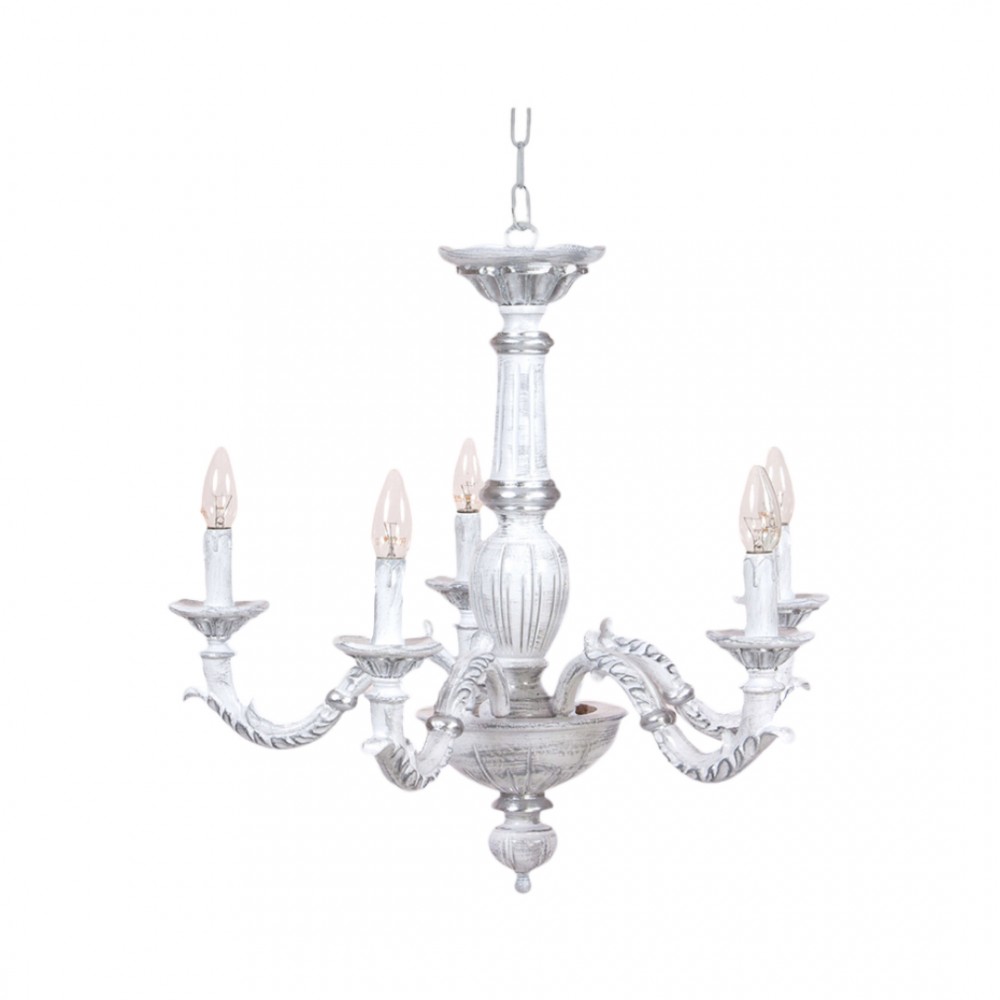 Lampadario realizzato a mano dai nostri mastri artigiani seguendo le più antiche tradizioni del legno. Struttura in legno intarsiato color bianco argento e grigio sfumato. Monta 5 lampadine E14 (non inclusa) . Adatto ad un arredamento classico e raffinato