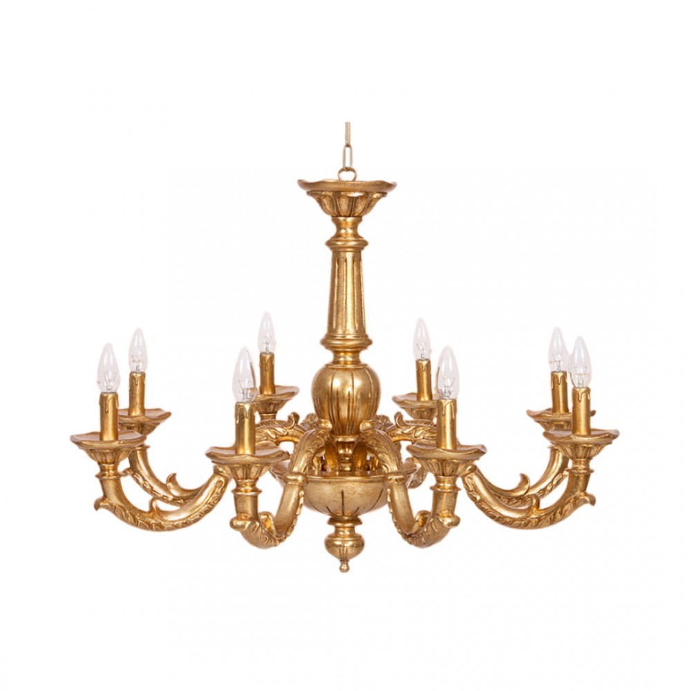 Lampadario realizzato a mano dai nostri mastri artigiani seguendo le più antiche tradizioni del legno. Struttura in legno intarsiato color oro. Monta 8 lampadine E14 (non inclusa) . Adatto ad un arredamento classico e raffinato