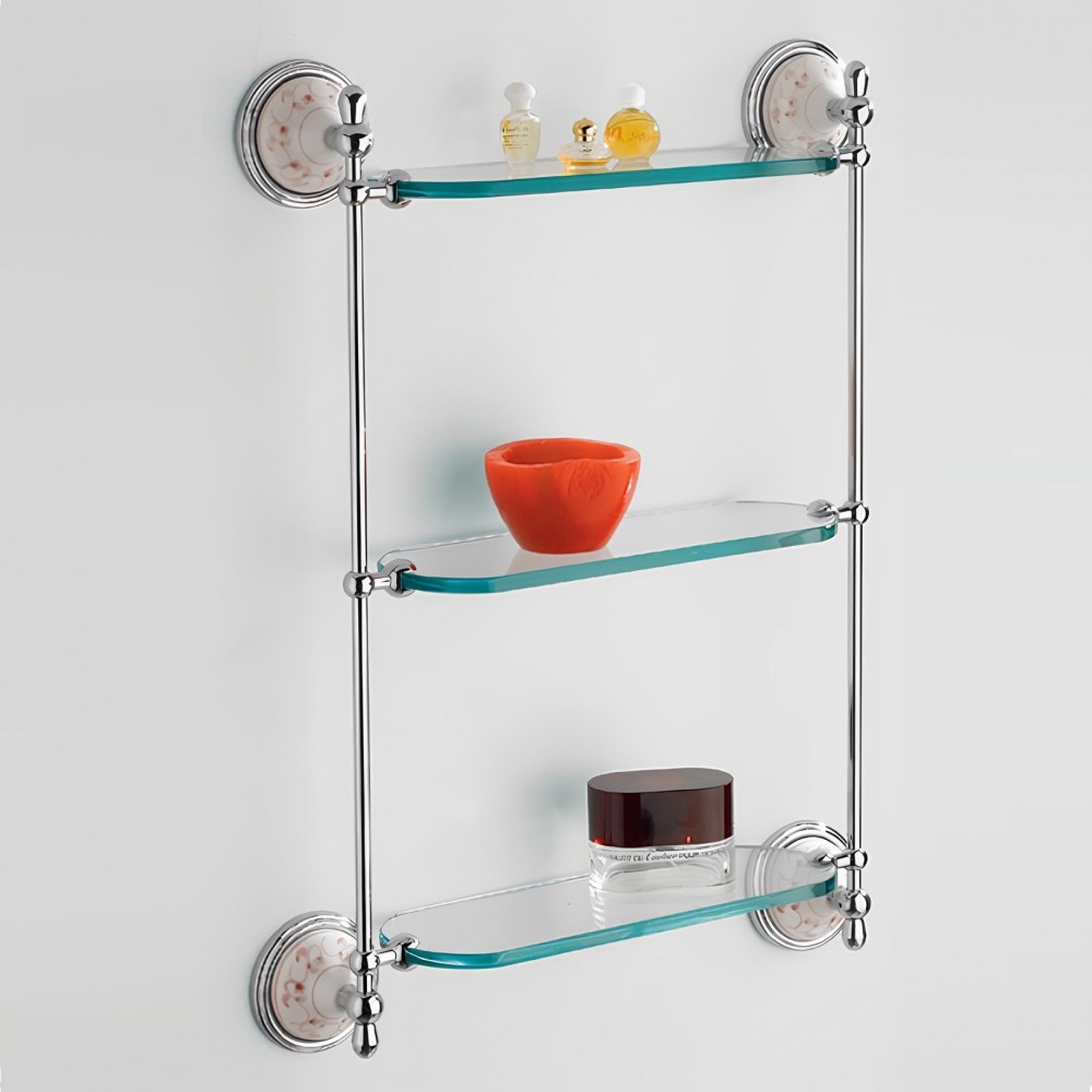 Pensile per mensole in vetro, cristallo super trasparente al piombo, per bagno stile classico, realizzato artigianalmente. Particolari in ceramica decorata a mano. Cromatura galvanica inossidabile.