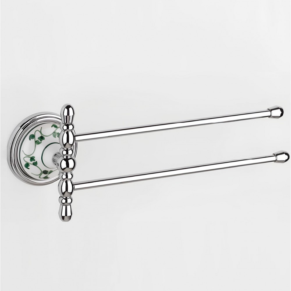 Asta doppia porta asciugamani a snodo da bagno classico, realizzato artigianalmente. Particolari in ceramica decorata a mano. Cromatura galvanica inossidabile.