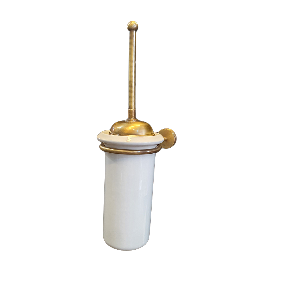 Porta scopino da bagno classico, realizzato artigianalmente a mano. Invecchiato galvanicamente e laccato con vernice trasparente. Un elemento semplice e dal costo contenuto, ma che mantiene tutte le caratteristiche qualitative e produttive di prodotti di fascia superiore.