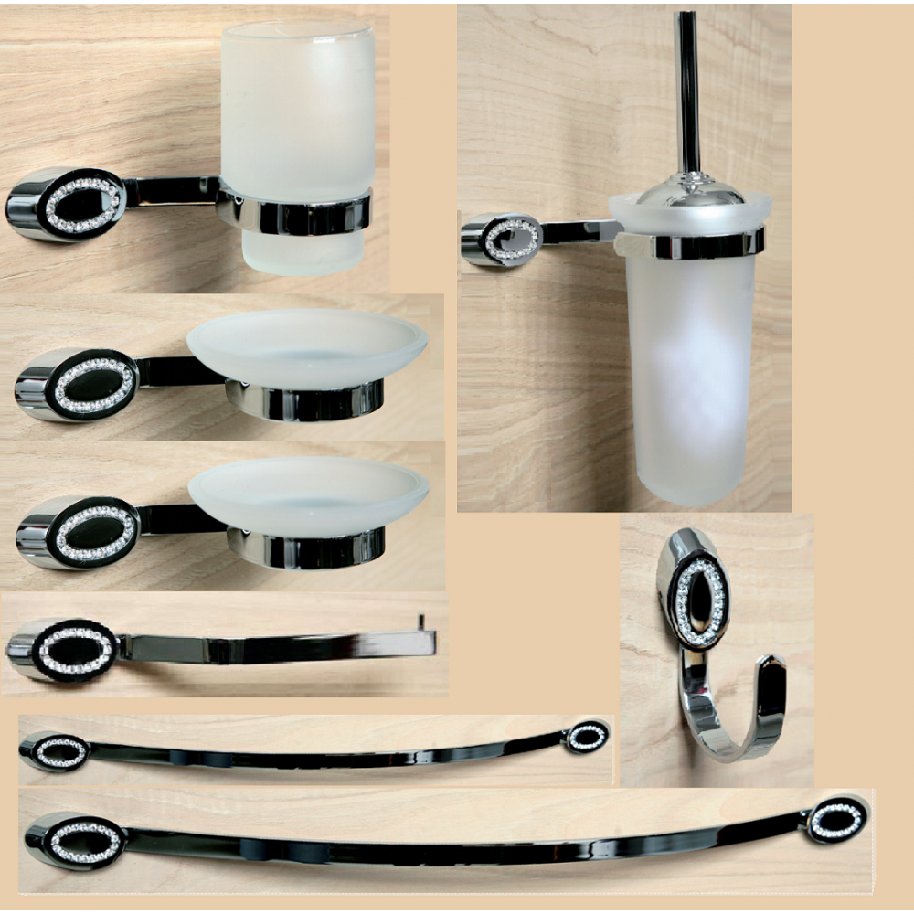 Set da bagno moderno, realizzato artigianalmente a mano. Cromatura galvanica inossidabile. Particolari in svarowski crystal Compreso nel set: 1 porta spazzolini, 2 porta sapone, 1 porta rotolo, 1 gancio accappatoio, 1 porta asciugamani grande, 1 porta asciugamani piccolo, 1 scopino WC.