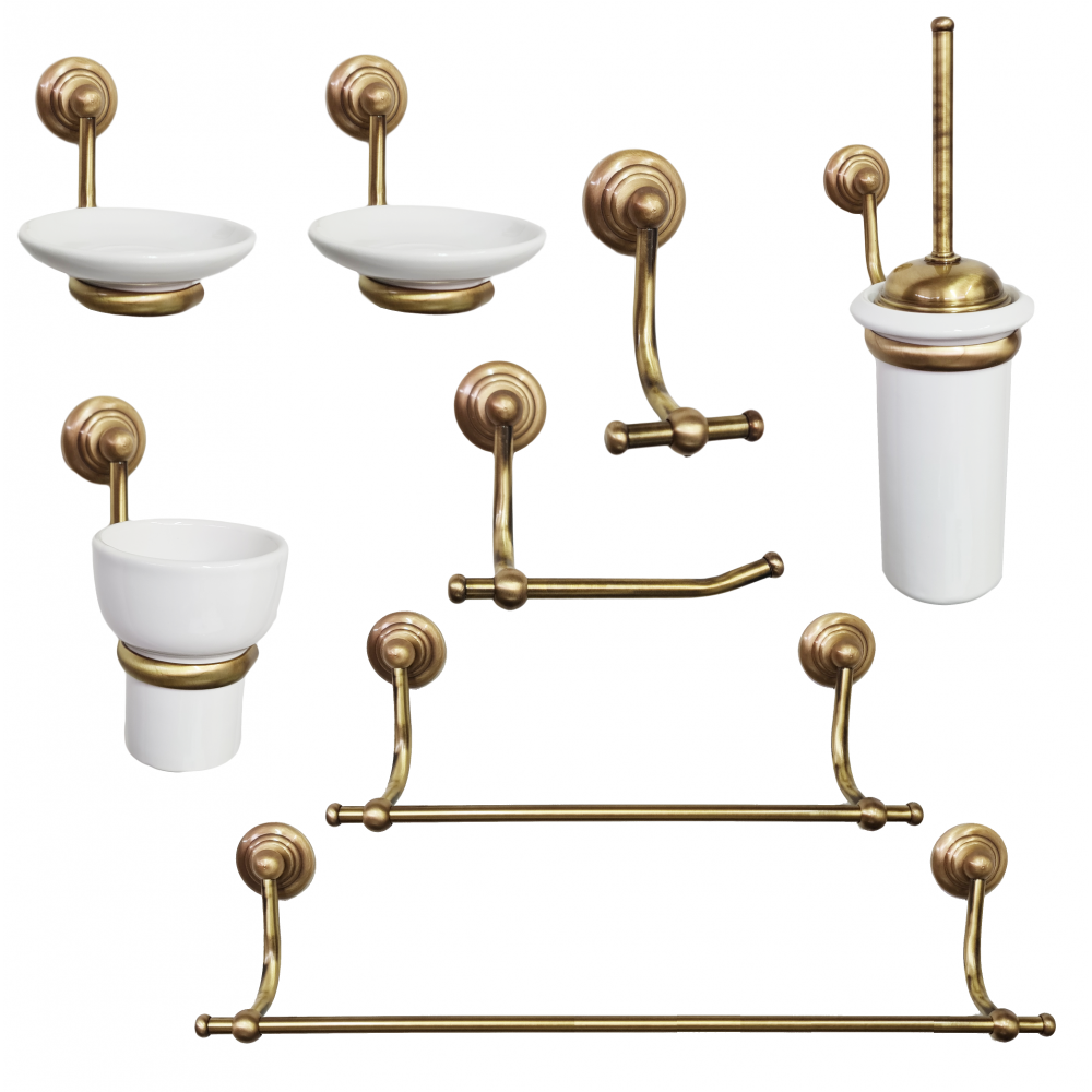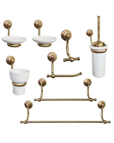 Set da bagno classico, realizzato artigianalmente a mano. Invecchiato galvanicamente e laccato con vernice trasparente. Compreso nel set: 1 porta spazzolini, 2 porta sapone, 1 porta rotolo, 1 gancio accappatoio, 1 porta asciugamani grande, 1 porta asciugamani piccolo, 1 scopino WC.